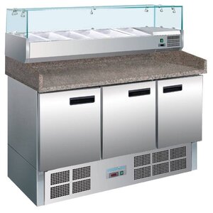 Gekoelde werkbank met een marmeren werkblad. Deze werkbank is ideaal om pizza's, broodjes of andere lekkere sandwiches voor te bereiden. Gekoelde bovenruimte geschikt voor 6 x GN 1/4 bakken tot 100mm. Drie zelfsluitende deuren.