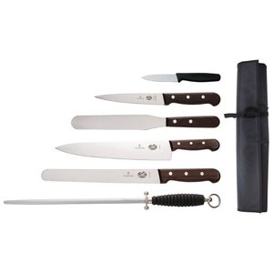 Hoge kwaliteit, 6-delige messenset van het Zwitserse Victorinox, met een vlijmscherp RVS lemmet en een geklonken, palissander heft (behalve het schilmesje dat een nylon heft heeft).
