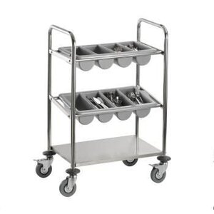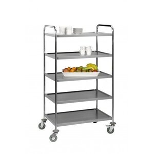De serveerwagen met 5 RVS bladen is geschikt voor de gastronomie. De serveerwagen met 5 bladen is van hoogwaardig RVS vervaardigd. De serveerwagen is een ideale oplossing voor het afruimen van vaat in hotels.