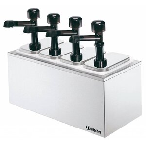 Deze sausdispencer met 4 pompen van Bartscher is geschikt voor het gebruik in een snackbar of in een professionele keuken. De sausdispencer wordt inclusief Gastronorm bak geleverd. De Gastronorm container is volgens de Europese norm vervaardigd.